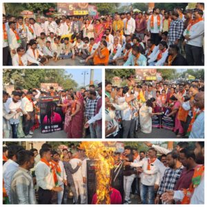 अमळनेर (प्रतिनिधी) माजी खासदार उन्मेष पाटील यांनी केलेल्या शिवराळ वक्तव्याचा महायुतीच्या कार्यकर्त्यांनी निषेध केला. या वेळी त्यांनी प्रथम महाराणा प्रताप चौकात रास्ता रोको केला, त्यानंतर त्यांच्या फोटोवर काळे फासून, चप्पल-बुटांनी मारहाण करून अखेर पुतळा जाळत संताप व्यक्त केला.
